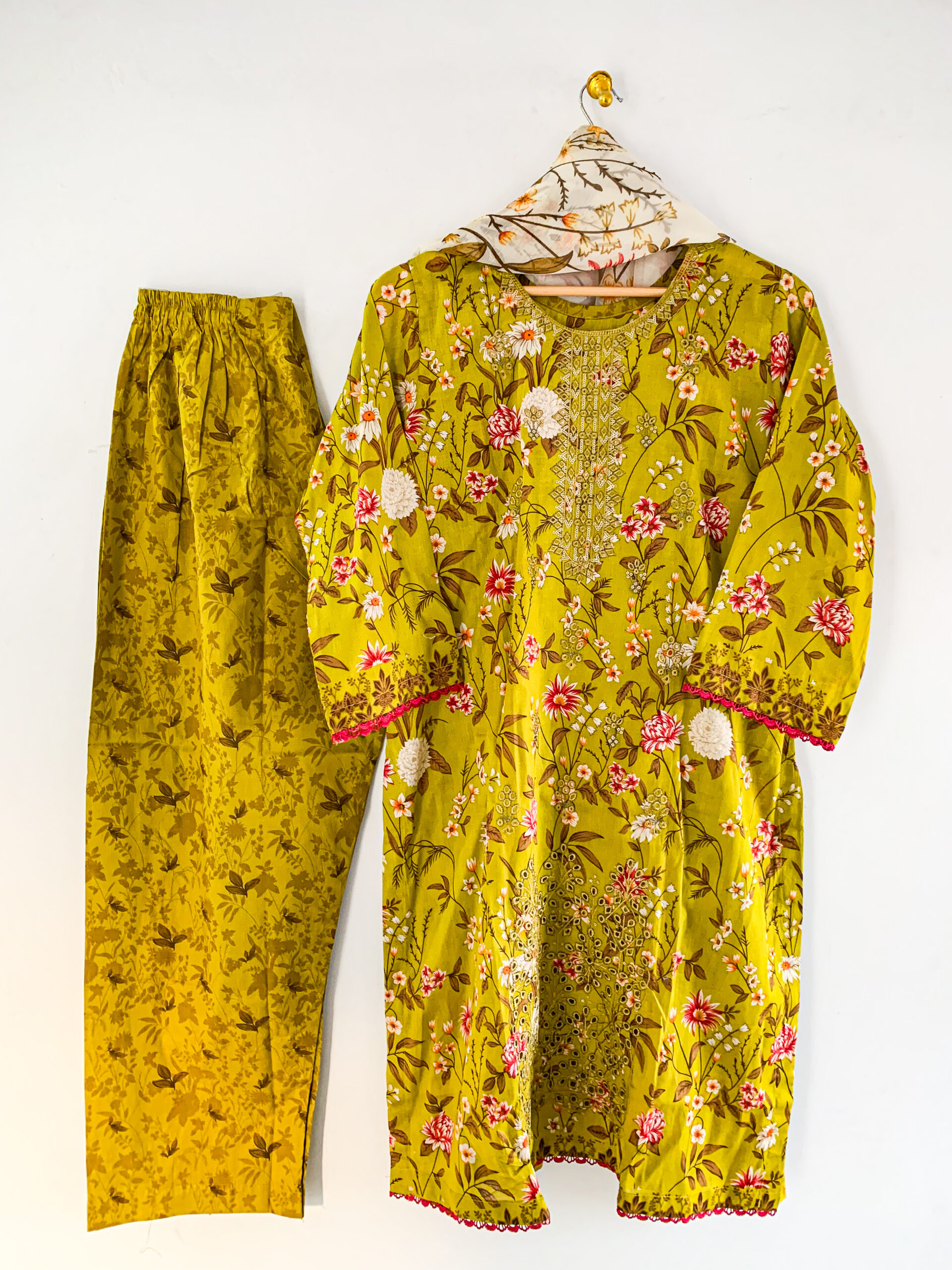 Radiate effortless elegance with the Golden Gulbahar Lawn Printed Stitched 3PC, a vibrant ensemble that brightens your everyday wardrobe. Drenched in a rich golden hue and adorned with delicate floral prints in lively shades, this three-piece set beautifully blends tradition with contemporary charm.